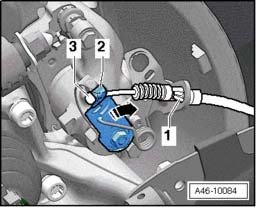 - Press brake lever -2- in direction of -arrow- and unhook parking brake cable -3-.