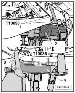 - Place Engine/transmission jack V.A.G 1383 A with Universal Transmission Support V.A.G 1359/2 under subframe and secure with Tensioning Strap T10038.