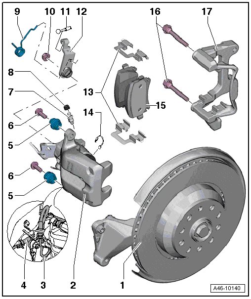 Before installing the brake pads, clean the pad guide surface and coat it with a film of grease. Refer to the Electronic Parts Catalog (ETKA).