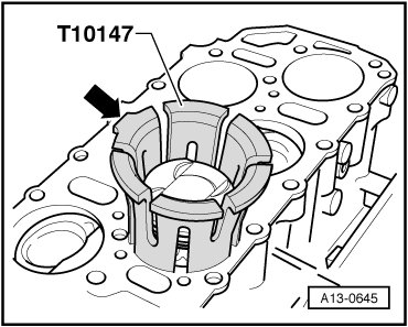 • If a new Piston Insertion Funnel (T10147) is used, pistons must first be guided twice through the funnel with lubricated piston rings and any shavings resulting from this must be removed. Then the pistons can be installed with piston rings.