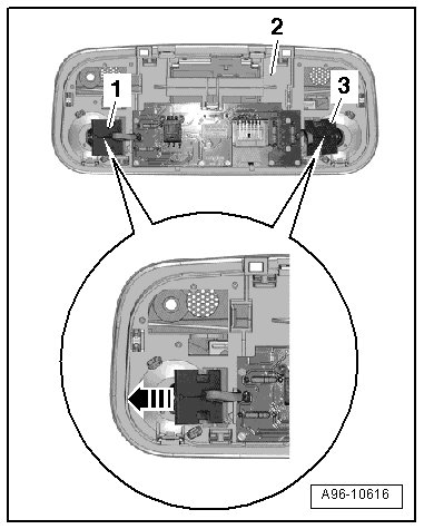 - Slightly lift the LED board - 1 - and - 3 - pull it in - direction of arrow - out of the socket - 2 -.