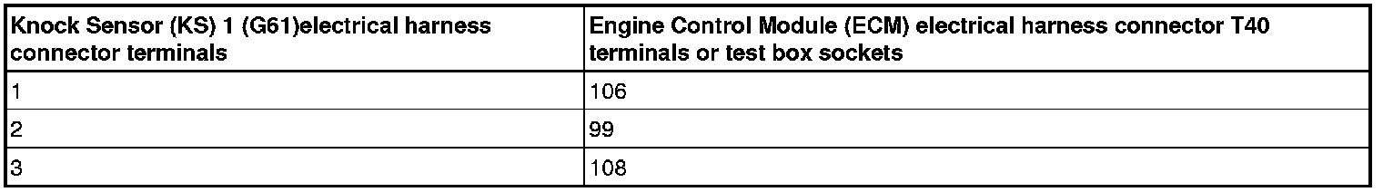 - Using a Multimeter, Check the Knock Sensor (KS) 1 (G61) electrical harness connector to the Engine Control Module (ECM) (J623) electrical harness connector T40 for resistance.