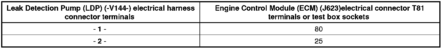 - Using a Multimeter, check the Leak Detection Pump (LDP) (-V144-) electrical harness connector terminal 1 to Engine Control Module (ECM) (J623) electrical harness connector T81 terminal 80 for resistance.