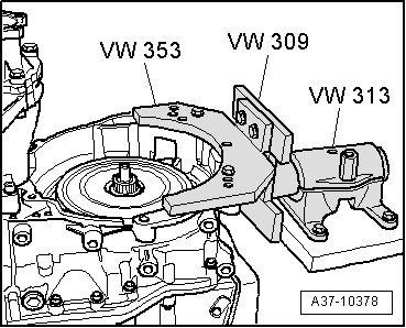- Secure transmission to transmission support (VW 353) and place into holding fixture (VW 313) with holding plate (VW 309).