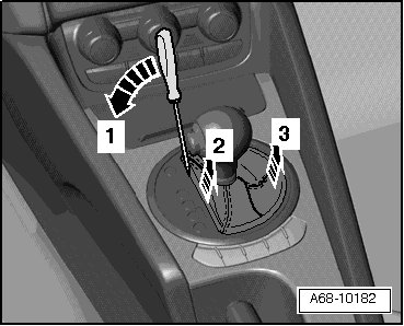 - Release selector lever lock solenoid - A - by pressing lever - B - inward - arrow - with a screwdriver - 1 - and hold in this position.