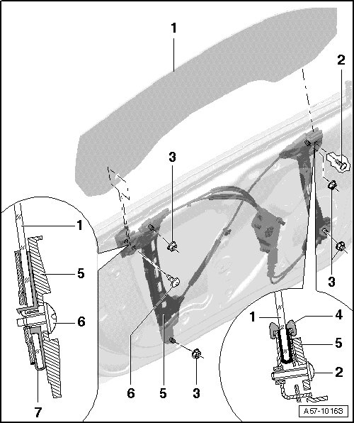 • Press window back into window guide and tighten bolts - 2 - and - 6 - slightly.