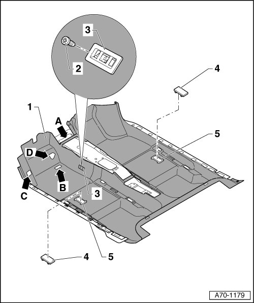 - Slide floor mat - 1 - all the way forward until the pattern holes in the base support - arrow C -, accelerator pedal - arrow B - and accelerator pedal stop - arrow D - align.