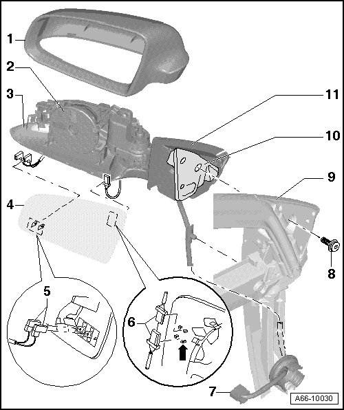 • Pry out the mirror glass, disconnect the connectors for the mirror heating, remove the screws - 6 - and remove the mirror adjuster from the mirror housing - 1 -.