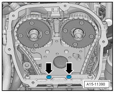 - Tighten the bolts - arrows -. Refer to => [ Camshaft Timing Chain Overview ] Camshaft Timing Chain Overview.