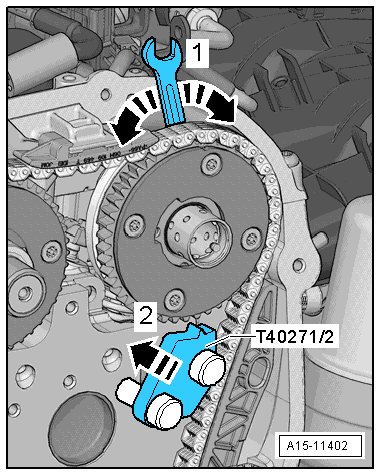 - Turn the exhaust camshaft with the wrench in the direction of the - arrow 1 - and slide the camshaft locating tool (T40271/1) in the chain sprocket splines in the direction of the - arrow 2 -.