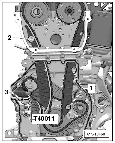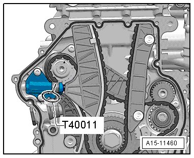 - Install the drive chain for the oil pump and the chain tensioner. Tighten the bolt - 1 - and remove the (T40011).
