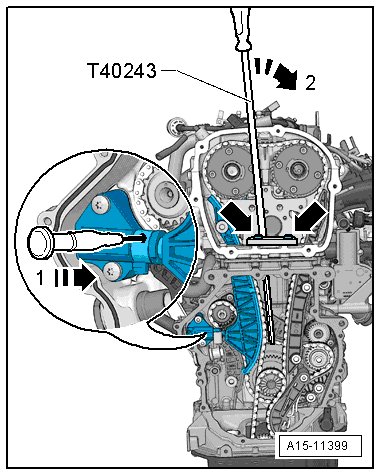 - Lift the chain tensioner locking wedge by inserting a scriber or a suitable screwdriver into the hole in the chain tensioner in the direction of the - arrow 1 - and hold it there.