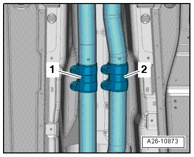 - Loosen the clamping sleeves - 1, 2 -, push them toward the rear and slowly lower the catalytic converters.