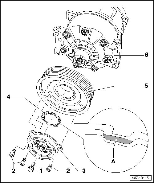 • On A/C compressors with part number 1K0 820 803 as of index N, the drive plate splines are bonded to A/C compressor shaft splines, removing drive plate, refer to=> [ Belt Pulley, Zexel/Valeo ] Belt Pulley, Zexel/Valeo.