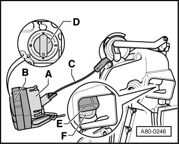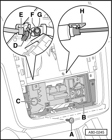 - Reach into center console and release ball on Bowden cable - F - from operating lever - G - (only present on vehicles without A/C system).
