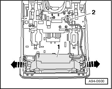 - If equipped, release the retaining clips - arrows - and remove the interior monitoring sensor (G273) - item 1 - from the interior lamp/reading lamp.