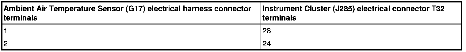 - Using a multimeter, check the Ambient Air Temperature Sensor (G17) electrical harness connector terminals 1 and 2 to the Instrument Cluster electrical harness connector T36 for an open circuit or a short, refer to the appropriate wiring diagram.