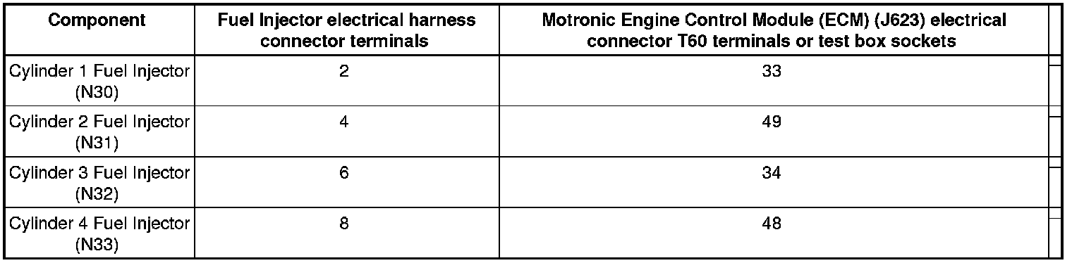 - Using a multimeter, check the Fuel Injector electrical harness connector terminals to the Motronic Engine Control Module (ECM) (J623) electrical harness connector T60 terminals for an open circuit.
