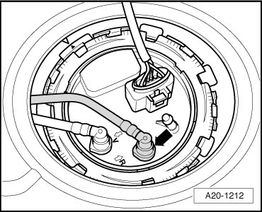 - Disconnect the fuel return line - arrow - by pressing release buttons.