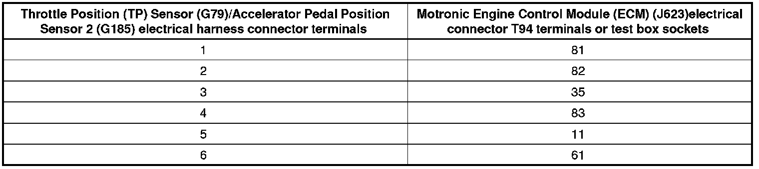 - Using a multimeter, check the Throttle Position (TP) Sensor (G79)/Accelerator Pedal Position Sensor 2 (G185) electrical harness connector terminals to the Motronic Engine Control Module (ECM) (J623) electrical connector T94 for an open circuit.