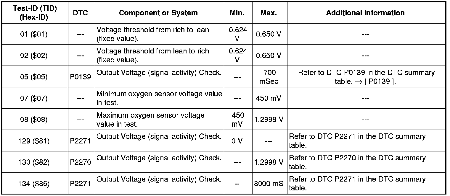 - If any of components or systems fail to meet the specified values. Refer to Diagnostic "Mode 03: Interrogating Fault Memory" to check for stored DTC or the corresponding diagnostic repair procedure => [ Diagnostic Mode 03 - Read DTC Memory ] Diagnostic Mode 03 - Read DTC Memory.