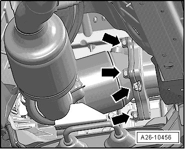 - Remove exhaust system bracket - arrows -.