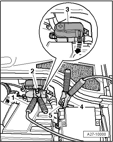 - Release retaining clamps - arrow - in engine compartment and open cover - 3 - over positive terminal grip.