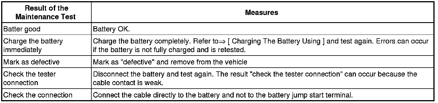 - On a battery with a visual indicator, check its color display. Refer to => [ Electrolyte Level Color, Checking ] Electrolyte Level Color, Checking.