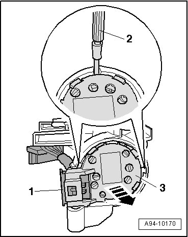 - Remove ignition switch - 3 - in - direction of arrow - from steering lock housing. The jeweller's screwdriver or wire hooks must remain inserted.