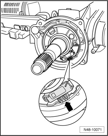 The new steering pinion with steering angle sensor as an anti-twist mechanism - arrow -. This may only be removed after locking to sensor wire.