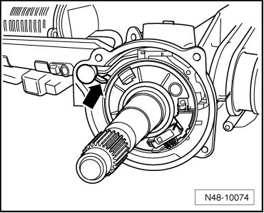 - Rotate steering pinion until spiral spring with sensor wire - arrow - can be locked. While doing this, the marking applied during removal must align with steering gear housing.