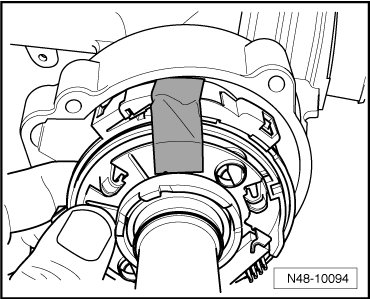 - Now pull steering pinion with steering torque sensor out of steering gear housing. Secure spiral spring against twisting using for example adhesive tape.