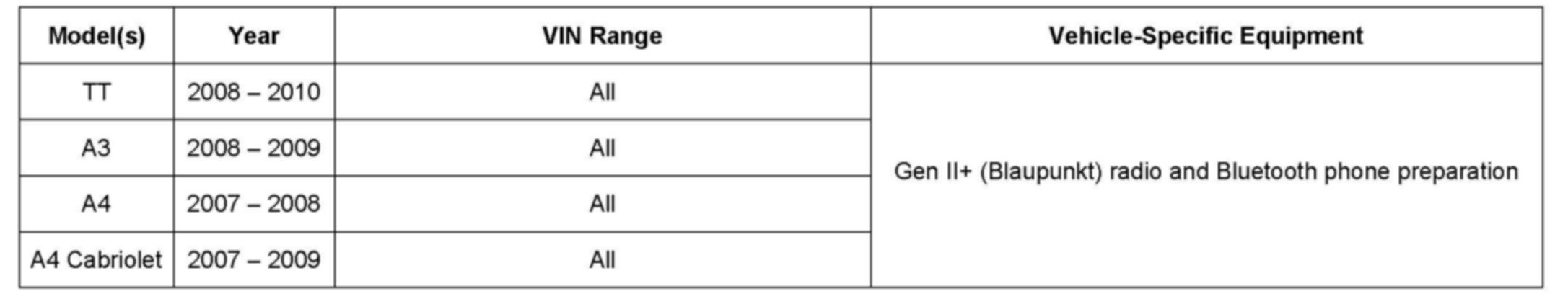 For A3, A4, A4 Cabriolet and TT vehicles: