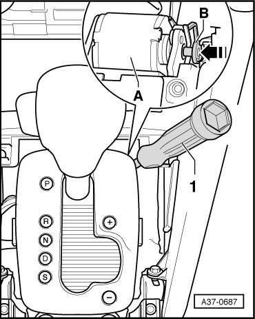 - Use a screwdriver - 1 - to release the shift lock solenoid - A -.
