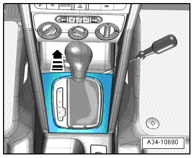 - Remove the side of the selector lever boot with a flat blade screwdriver or with the trim removal wedge (3409) and pull it upwards - arrow - to the handle for the selector lever. In order to loosen it, the (3409) must go on the lower edge of the side.