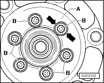 - Rotate dual mass flywheel - A - so bolts - B - are centered to holes - arrows -.