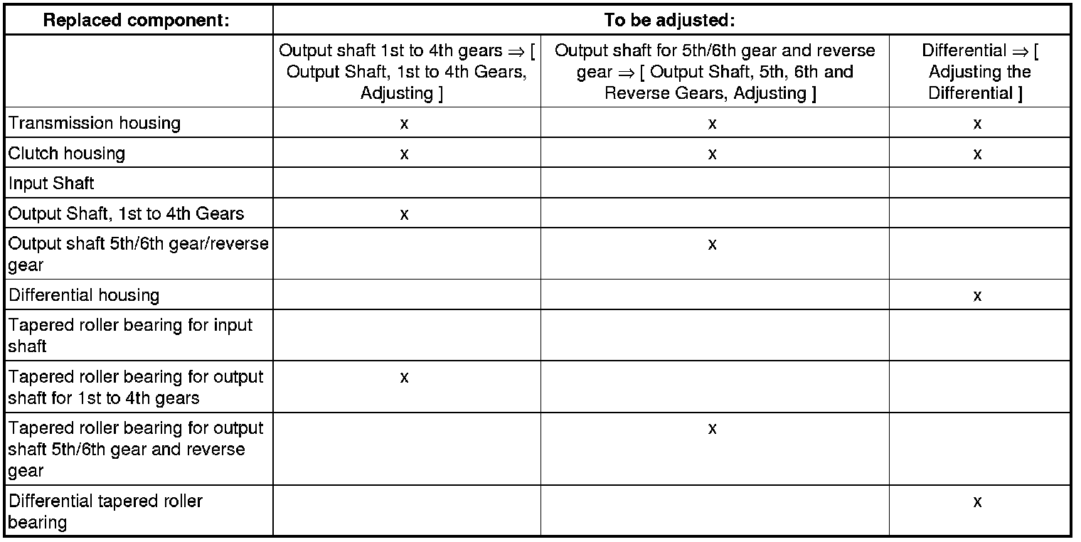 • When performing repairs on the transmission, readjustment of the output shaft for 1st to 4th gears, output shaft for 5th/6th gear and reverse gears or differential is only required if components, which have a direct influence on transmission adjustment, have been replaced. Observe the following table to avoid performing unnecessary adjustments: