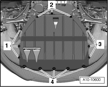 - Remove noise insulation in center by loosening fasteners - 1 through 4 -.