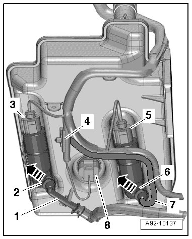 - Open the clamp - 6 - - right arrow - and disconnect the fluid line - 7 - from the washer fluid pump.