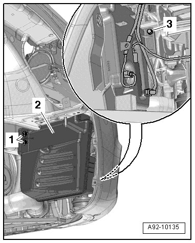 - Remove the nuts - 1 - and then remove the windshield washer fluid reservoir - 2 -.