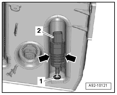 - From above, push the windshield washer pump (V5) - item 2 - into the windshield washer fluid reservoir; while doing this the washer fluid pump is guided by both mounting tabs - arrows -.