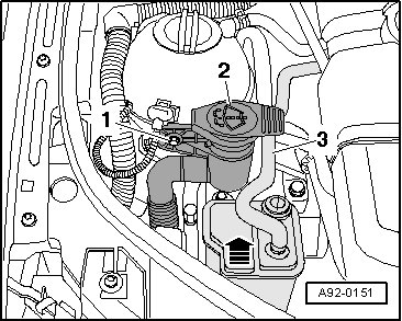 - Remove the line - 3 - on the filler tube - 2 - for the windshield washer fluid reservoir to the EVAP canister.