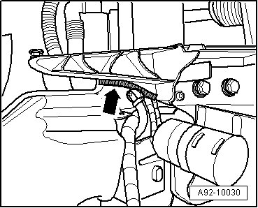 - Make sure that the fuel line edge protection - arrow - on the lock carrier - 1 - and that the wiring harness are not missing.