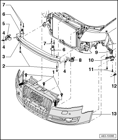 • Bumper cover, removing and installing => [ Front Bumper, from MY 2006 ] Front Bumper, From MY 2006.