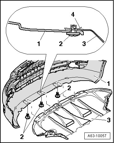- When removing bumper cover - 1 -, turn clamping pins - 2 - 180° and remove from spring nut - 4 - on sound insulation - 3 -.