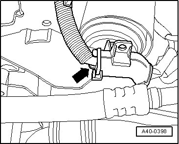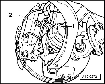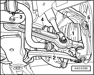 To avoid damaging upper control arm joints, wheel bearing housing must be braced against a rebound that is too strong, e.g. using Engine/Transmission Jack (V.A.G 1383 A)