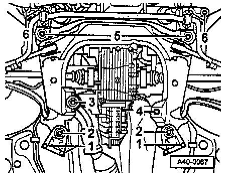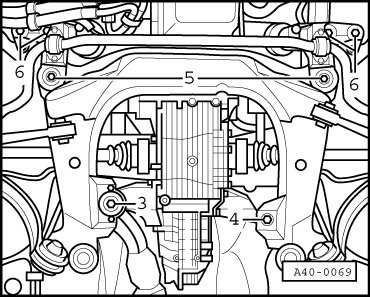 - Insert subframe and install hex bolts - 5 - and - 6 -.