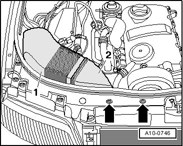 - Remove air duct from in front of charge air cooler at left and right - arrows -.