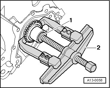 - Pull off crankshaft chain sprocket with claw puller - 2 - e.g. Kukko 44-1, while protecting end of crankshaft with thrust piece (40 - 105).