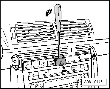 - Carefully lever out Emergency Flasher Button ( E229) - 1 - from switch mounting - arrows - using a flat screwdriver.